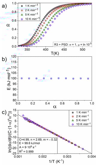(a) Curves simulated under linear heating conditions using the kinetic model R3 with the PSD shown in Figure 1b. (b) Values of activation energy as a function of the fractional reaction obtained by the Friedman isoconversional method. (c) Combined kinetic analysis.