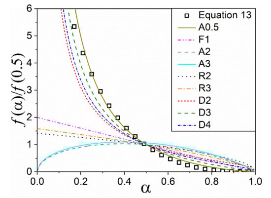 Comparison between the modified Sestak–Berggren equation obtained from combined analysis (open black squares) and some ideal kinetic models from the literature (lines) [].