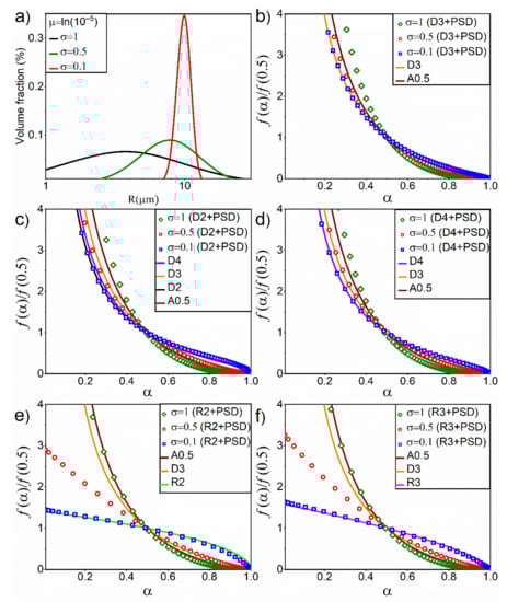 The study on how PSD modifies the shape of the R3 kinetic model was extended to other ideal models, such as interface growth and diffusion-controlled models (Figure 5 shows the results). In this study, three possible PSDs with = 0.1, 0.5, and 1, while maintaining constant, were considered in the calculus, (see the resulting PSD curves in Figure 5a). As observed in Figure 5b–d, in the cases of diffusion models, it is hard to discern if the reaction is described by one model or another when PSD comes into play. For instance, a sample with a PSD characterized by and that reacts according to D2 could be wrongly assigned to a D3 model (Figure 5c), while D3 can be confused with a nucleation A0.5 model (Figure 5b) when considering PSD.