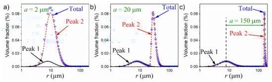 Bimodal particle size distributions using the simulations. The total PSD was calculated as the sum of two lognormal functions, with and being the amplitude of the second peak ten times the amplitude of the first one. The separation between peaks was set at (a) 2 μm, (b) 20 μm, and (c) 150 μm.