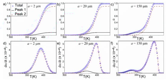 (a–c) Curves of as a function of temperature, simulated using the R3 kinetic models modified by bimodal PSD, with = 1 K·min−1 and a = 2, 20 and 150 μm, respectively. (d–f) Derivative of α with time as a function of temperature for a = 2, 20 and 150 μm, respectively.