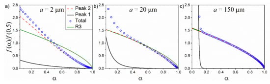 The extent of the reaction and its derivative as a function of temperature are plotted in Figure 7. These data were simulated assuming linear heating conditions with a heating rate of K·min−1. As in the case of Figure 6, the contribution of each peak is depicted separately as a line, while the total is plotted as open blue circles. As can be observed, the separation between peaks has a clear impact on the shape of the curves -T (Figure 7a–c) and derivatives (Figure 7d–f). For the largest value of a used, the derivative clearly exhibits two humps. This can be explained by the fact that the smaller particles in the left peak of the PSD require much less time to attain a complete reaction than those particles in the right peak of the PSD. Such behavior was observed in Figure 1. Therefore, when the smaller particles complete the reaction, at low values of temperature, a considerable portion of the volume occupied by the larger ones remains unreacted. This result could lead to the misleading conclusion that the reaction is driven by two processes or mechanisms separated by temperature. Therefore, taking PSD into account when performing kinetic analysis is crucial to avoid such mistakes.