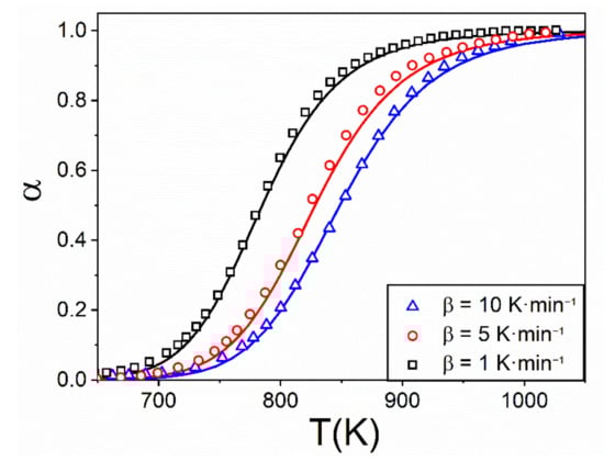 Reacted fraction as a function of temperature in the experiments conducted under linear heating conditions: 1, 5, and 10 K·min−1. Experimental data are depicted as open symbols. Solid lines represent the curves reconstructed using the modified Sestak–Berggren equation (Equation (13)), where n = 2.425 and m = −0.177.