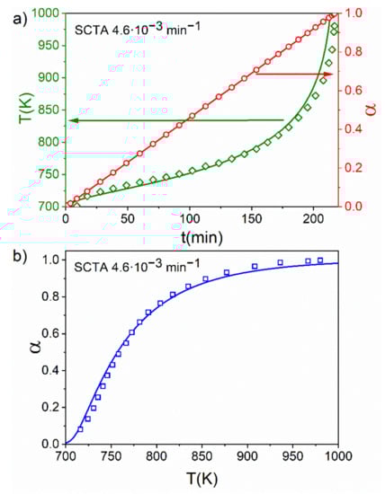Dehydroxylation of kaolinite conducted under SCTA (4.6·10−3 min−1). (a) Time evolution of the reacted fraction and temperature during reaction. (b) Reacted fraction as a function of temperature. Experimental data are depicted as open symbols. Solid lines represent the curves reconstructed using the kinetic parameters resulting from the analysis.