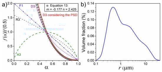 By applying the combined kinetic analysis (Equation (14)), it can be observed that the set of experimental data could be linearized in the entire range for the kinetic model , resulting from the optimization process (Figure 11d). Moreover, the value of the apparent activation energy obtained from the slope (E = 191 1 kJ/mol) is coincident with that obtained by the isoconversional method. Using the resulting kinetic parameters, the experimental curves could be well reconstructed, as shown in Figure 9 and Figure 10. However, the resulting kinetic function does not match any of the ideal kinetic models in the entire range of values for (Figure 12a). Thus, except for low values of , it fits the D3 kinetic model; for large values, there is a clear deviation from the D3 model, which explains the results in Figure 11c where experimental data could be fitted with a D3 kinetic model only for values of alpha smaller than 0.6, in agreement with previous studies [,]. Nevertheless, if the PSD measured experimentally for this sample (Figure 12b) is taken into consideration in the D3 kinetic model, using the same procedure described above for the log normal distribution, the resulting model matches well with the kinetic model resulting in this combined kinetic analysis (Figure 12a). This could be interpreted by considering that kaolinite dehydroxylates according to a D3 model, but the broad particle size distribution plays a significant role in its kinetics in such a way that the time required to achieve a given degree of dehydroxylation depends on the particle size. The non-consideration of PSD leads to discrepancies when comparing the experimental data with the ideal kinetic models. This could be a feasible explanation for the deviation found for the dehydroxylation of kaolinite when interpreted in terms of ideal diffusion models.
