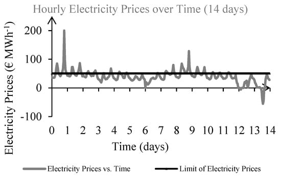 In this work, as we concentrated on the German electricity market, we used day-ahead electricity prices as provided by the EPEX SPOT for the calculations. At the time of writing of this document, EPEX SPOT data were available until the end of 2020. For this work, we needed to know electricity prices for at least 14 consecutive days, 24 h a day, as the software used a 14 day data set on a loop for the whole duration of simulations. As it was decided for this work to concentrate on the most recent data, we selected a set of data in autumn 2020 with the values lying between 21 September 2020 and 4 October 2020—this is also shown in Figure 1. During this time, the average electricity price was equal to 39.99 € MWh−1, with 50% of the values being equal to or lower than the average.