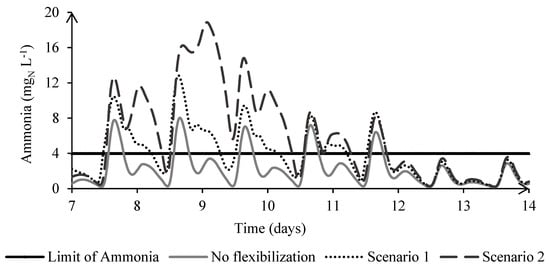 Based on Figure 2 above, the time series for the no-flexibilization scenario indicated that the presented control strategies were unable to maintain the ammonia concentration in the effluent below the critical value as defined for the BSM1 model (4 mgN L−1) throughout the whole time period of 7 days. The same was true for the remaining strategies. The fact that this also applied to the default strategy (strategy 1) indicates that the BSM1 model has been designed so that water quality in the effluent does not meet the required criteria all the time.