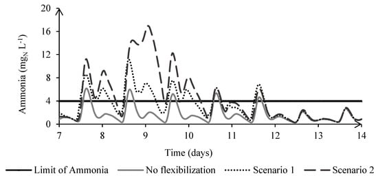 Taking into account the results described above, a comparison between the strategies in relation to their flexibility capacity and treatment performance was carried out for each scenario. The percentage of time during which the concentration limit for ammonia in the effluent was not met was quantified, along with the energy consumption as the sum of aeration energy and pumping energy. In this work, the pumping energy was regarded as the sum of the energy consumed for the removal of the excess sludge for the internal recycle and for the external one. Results are summarized in the following sections.
