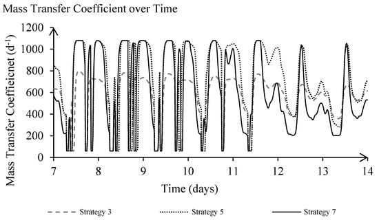 Similarly to the case where the no-energy-flexibility scenario was applied, Strategy 5 both had the best performance with respect to percentage of time during which ammonia concentration in the effluent exceeded the limit and consumed the largest amount of energy over time. Even though Strategy 6 was no longer the strategy that consumed the lowest amount of total energy, it still remained the best among the ammonia-related control strategies. In terms of percentage of time during which aeration was shut off, this strategy was characterized by the second longest period during which aeration could remain suspended, behind only Strategy 4, for which difference with Strategy 5 was the inclusion of the nitrate controller. To this end, there seems to be some contradiction, as the strategy that maintained the air blowers switched off for more time than most of remaining strategies also had the highest energy consumption rate. However, as seen in Figure 4, which shows the course of the sum of the kLa values in all three aeration tanks for Strategies 3, 5, and 7, which were selected because all of them excluded the nitrate controller and their comparison was feasible, this occurred due to nature of the control strategy. In regard to this strategy, it is true that the air system was shut down for a long time, but for the rest of time, DO concentration values could freely soar up to 4 mgO2 L−1 each time that was required, significantly increasing the kLa values and consequently the energy consumption. However, based on the priorities set, Strategy 5 was still the best strategy in terms of performance. This strategy ensured the shortest period of time during which ammonia concentration surpassed the limit, which was the highest priority, and, at the same time, it ensured a quite long period of time during which aeration remained shut off, which was the second most important condition, as the idea was to buy as little electricity as possible during the times this was expensive.