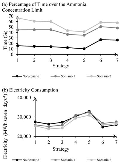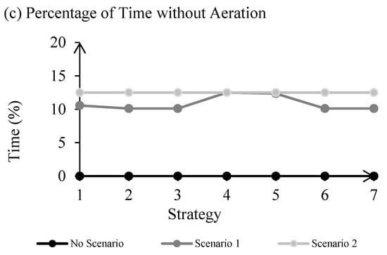 It is clear from Figure 5a that Scenario 1 removed more ammonia than Scenario 2. All control strategies for Scenario 2 ended up with a higher percentage of time over the ammonia concentration limit than their respective strategies for Scenario 1. This means that the undetermined cycle of Scenario 1, which was governed by effluent quality restrictions, complied with the regulations for a longer period of time than the predetermined cycle of Scenario 2, which was based on a fixed on/off aeration cycle.
