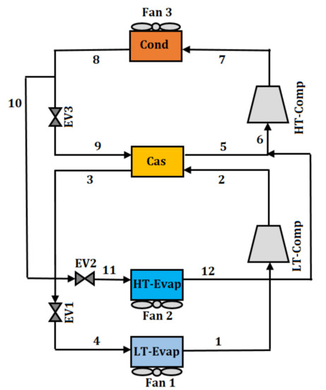 Figure 1 shows the simplified schematic layout of the dual-evaporator cascade vapor compression refrigeration cycle evaluated in this study. As illustrated by Figure 1, the dual-evaporator cascade cycle consists of a topping cycle or high-temperature (HT) cycle and a bottoming cycle or a low-temperature (LT) cycle. These topping and bottoming cycles are thermally connected through a cascade (Cas) heat exchanger, which plays a role as an evaporator for the HT cycle and as a condenser for the LT cycle.