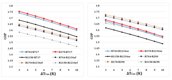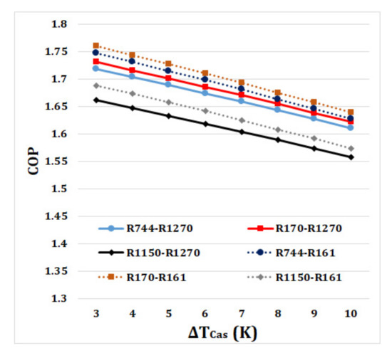 The temperature difference in the cascade heat exchanger (), which is the temperature difference between the state points 3 and 5 presented in Figure 1, has a significant influence on the performance of the refrigeration system. Figure 2 shows the effect of on the COP of the refrigeration system for different refrigerant pairs. The results demonstrate that with an increase in from 3 to 10 K, the COP decreases significantly for all refrigerant pairs. It is observed that all refrigerant pairs have almost the same trend of reduction with an increase in . The reason for a reduction in the COP is that with an increase , the temperature gap between state points 3 and 5 increases, which causes a reduction in the temperature of state point 5 because the temperature of state point 3 () is constant. This leads to increasing the and as a result, decreasing the COP for all. Among all selected refrigerant pairs, the highest values of COP are obtained for the R170-R161 pair, while the lowest values are obtained when the R1150-R1234yf pair is used as a refrigerant pair. Compared to R744-R717 as a typical refrigerant pair for cascade vapor compression refrigeration systems which its COP ranges between 1.598 and 1.740, R170-R161 shows slightly higher COP ranging between 1.639 and 1.760.