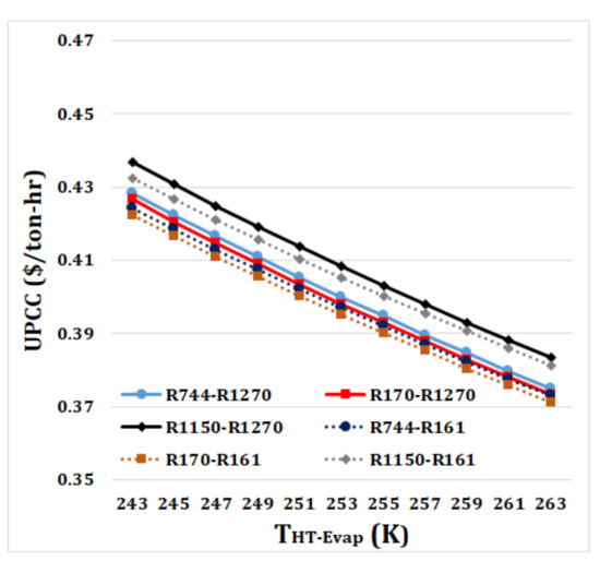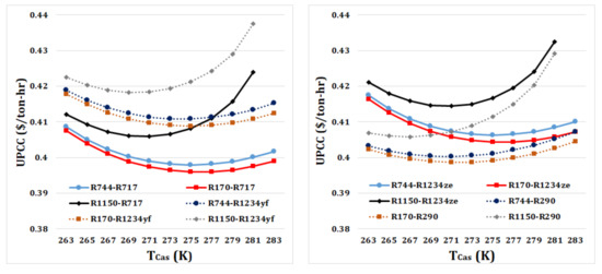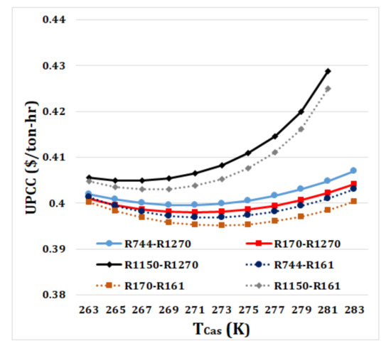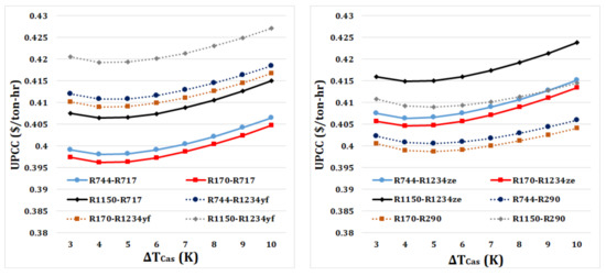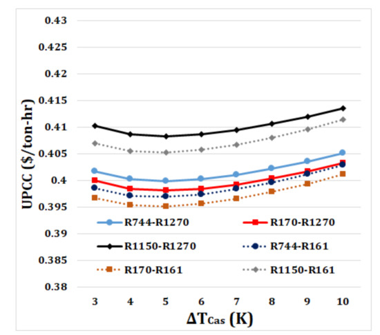 The influence of on the UPCC of the refrigeration system for different refrigerant pairs is shown in Figure 3. It is noted that for all refrigerant pairs, the UPCC slightly decreases first and then increases with a further increase in . As noted, with an increase in , the COP decreases which causes an increase in the AOC of the system mostly because of an increase in . On the other hand, with an increase in , the ACC decreases. The increase in the AOC and the decrease in the ACC along with an increase in causes that the UPCC decreases first and then increases. The minimum UPCC is obtained when is close to either 4 K or 5 K. The presented results in Figure 3 clearly show how changing the refrigerant pairs affects the economic performance of the system demonstrating the importance of the proper selection of a refrigerant pair on the economics of the refrigeration system. The lowest values of UPCC, ranging between $0.397/ton-hr and $0.401/ton-hr, are obtained when R170-R161 is used as a refrigerant pair while the highest UPCC values, ranging between $0.421/ton-hr and $0.427/ton-hr, are attained for R1150-R1234yf. For R744-R717 as a typical refrigerant pair of cascade refrigeration cycles, the UPCC values are between $0.399/ton-hr and $0.407/ton-hr which are slightly higher than those of R170-R161 as the most economical refrigerant pair.