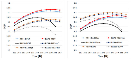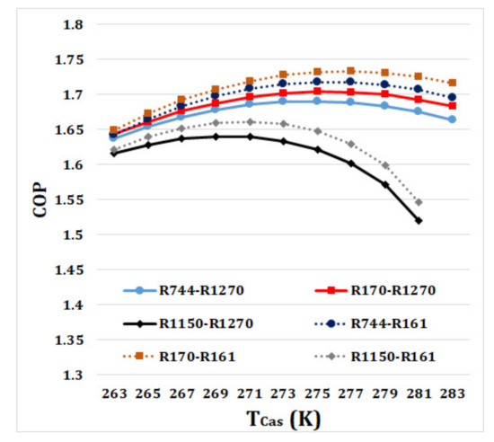 The highest COP values for all and values are obtained for the R170-R161 refrigerant pair. While the lowest COP values are obtained when R1150-R1234yf is used as a refrigerant pair. According to Figure 6 and Figure 8, using R170-R161 as a refrigerant pair, the COP increases from 1.577 to 1.855 with an increase in from 223 K to 243 K and increases from 1.514 to 1.965 with an increase in from 243 K to 263 K, respectively. While for R744-R717 as a typical refrigerant pair, COP increases from 1.539 to 1.835 and from 1.493 to 1.936, respectively. This shows an advantage of R170-R161 over R744-R717 for all examined ranges of or .