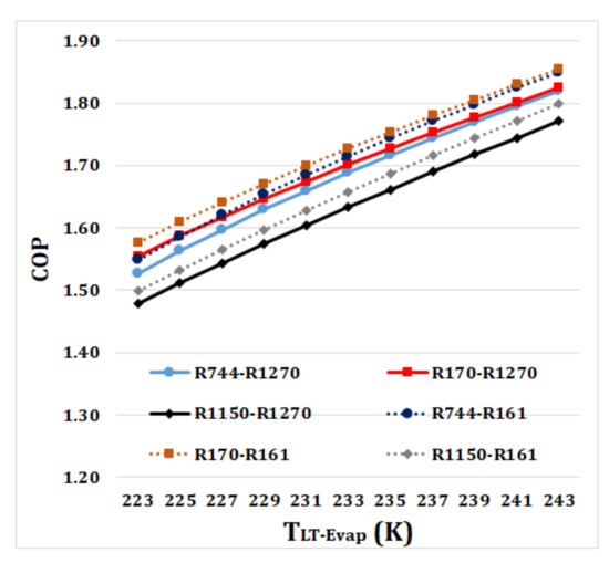 Effect of low-temperature evaporator () on the COP for different refrigerant pairs.