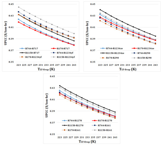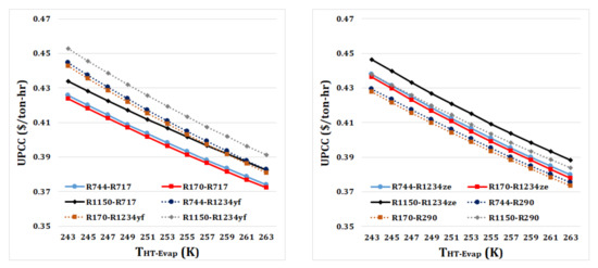 As shown in Figure 7 and Figure 9, the UPCC has a decreasing trend with an increase in both and . It is observed that the decreasing trend of UPCC is almost the same for all refrigerant pairs. With an increase in and , the AOC of the refrigeration cycle decreases mostly because of an increase in the COP. Also, the ACC decreases because of a decrease in the size of components, especially the compressors. The decrease of both AOC and ACC causes a reduction in the UPCC of the cascade refrigeration cycle. According to Figure 7 and Figure 9, the lowest values of UPCC are obtained when R170-R161 is used as a refrigerant, followed by R170-R717. R744-R717, as a typical refrigerant pair of cascade refrigeration cycles, is placed as the fourth-best refrigerant pair. With a variation of from 223 K to 243 K, the UPCC for the refrigerant pairs of R170-R161, and R170-R717 varies from $0.418/ton-hr to $0.378/ton-hr, and from $0.419/ton-hr to $0.379/ton-hr, respectively. When from 243 K to 263 K, the UPCC for the refrigerant pairs of R170-R161, and R170-R717 reduces from $0.422/ton-hr to $0.371/ton-h, and from $0.424/ton-hr to $0.372/ton-hr, respectively.