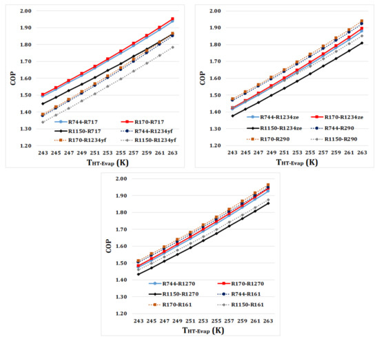 Effect of high-temperature evaporator () on the COP for different refrigerant pairs.
