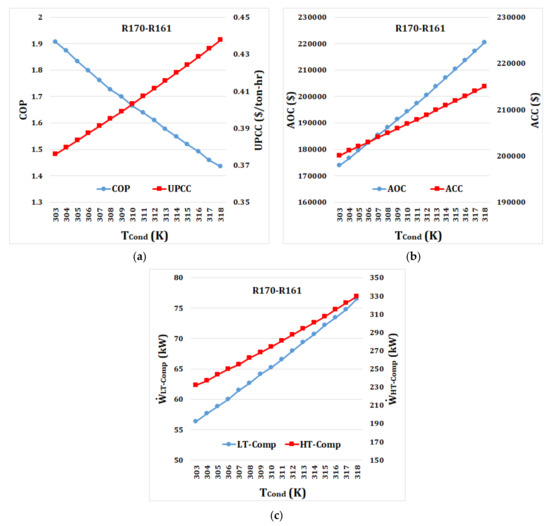 Figure 10 presents the effect of on several thermodynamic and economic parameters of the optimized cycle using R170-R161 as a refrigerant pair. With an increase in from 303 K to 318 K, the optimum values of and vary from 4.83 K to 4.34 K and from 269.7 K to 277.5 K, respectively. According to Figure 10a, an increase in causes a decrease in COP, and an increase in UPCC. When increases from 303 K to 318 K, COP decreases significantly from 1.903 to 1.436 and UPCC increases substantially from $0.376/ton-hr to $0.438/ton-hr. Figure 10b shows that both AOC and ACC increase with an increase in . AOC increases from $173,980 to $220,491 and ACC increases from $200,106 to $215,055 when increases from 303 K to 318 K. As shown in Figure 10c, both and increase significantly from 56.4 kW to 76.5 kW and from 232.1 kW to 329.3 kW, respectively. With an increase of , the power requirement of the compressor, especially the high-temperature compressor increases leading to a decrease in the COP and an increase in the AOC. Also, when increases, the ACC increases because of the increase in the size of the condenser and both compressors. The increase in both AOC and ACC causes a significant increase in the UPCC of the cascade refrigeration system.