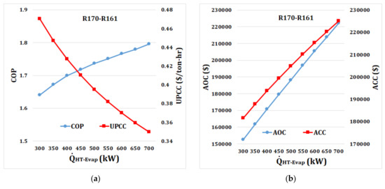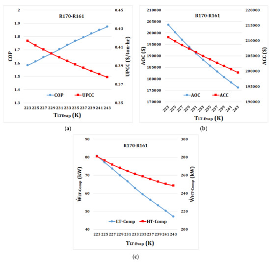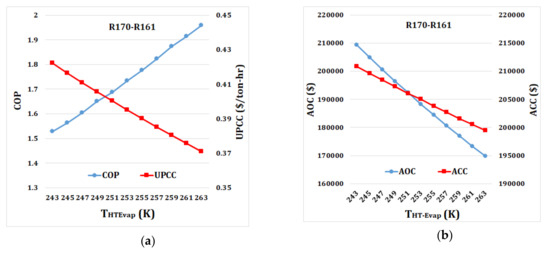 The influence of on different thermodynamic and economic parameters of the optimized cycle using R170-R161 as a refrigerant pair is shown in Figure 11. With an increase in from 223 K to 243 K, the optimum values of and change between 4.38 K and 4.91 K and between 268.6 K to 275.41 K, respectively. As shown in Figure 11a, with an increase in from 223 K to 243 K, COP increases from 1.584 to 1.875 while UPCC decreases from $0.417/ton-hr to $0.377/ton-hr. According to Figure 11b, both AOC and ACC decrease with an increase in . When increases from 223 K to 243 K, AOC and ACC decrease from $203,496 to $176,117 and from $211,072 to $199,513, respectively. Figure 11c shows that an increase in causes a reduction in and from 80.7 kW to 47 kW and from 280.7 kW to 248.2 kW, respectively.