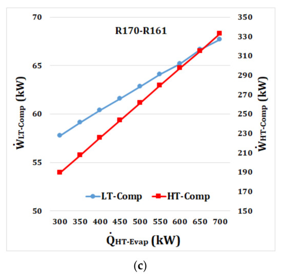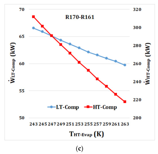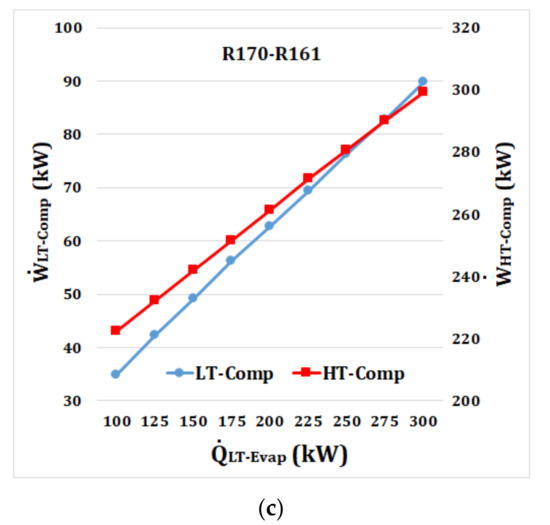 and are the pressures at the outlet and inlet of the compressors, respectively. and are the electrical and mechanical efficiencies of the LT-Comp and HT-Comp, which are assumed to be a constant value equal to 0.95 [29].