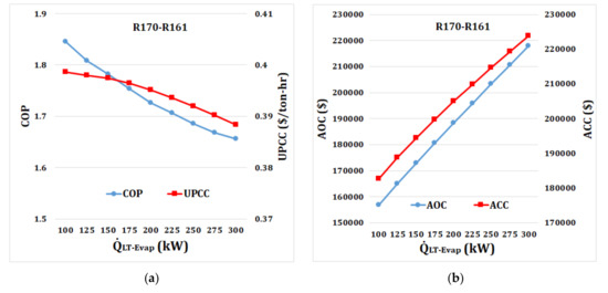 In all previous analyses of this study, and were set fixed at 200 kW and 500 kW, respectively. It is, however, interesting to examine the influence of and on different thermodynamic and economic parameters of the cascade refrigeration cycle. With an increase in , the optimum values of and vary from 4.48 K to 4.63 K and from 275.1 K to 271.2 K, respectively. Figure 13a shows the influence of a change in on COP and UPCC. The results show that with an increase in , COP and UPCC decrease, but with a different trend. When increases from 100 kW to 300 kW, COP and UPCC decrease from 1.845 to 1.656 and from $0.398/ton-hr to $0.388/ton-hr, respectively. As shown in Figure 13b, both AOC and ACC increase from $156,737 to $217,859 and from $182,650 to $223,824, respectively. According to Figure 13c, and both increase with an increase due to an increase in the size of the refrigeration system. increases from 34.9 kW to 89.7 kW and increases from 222.5 kW to 299.4 kW.