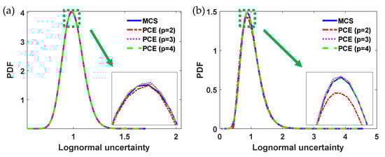 Illustration of the effect of polynomial order on the approximation accuracy of a lognormal uncertainty. The PCE-based approximation of a lognormal uncertainty is built with the normalized Gaussian variable with different polynomial orders and compared to the MC-based method. The mean value of was set to 1 in both graphs, but two different standard deviations were used: 0.1 was used in (a) and 0.3 was used in (b).