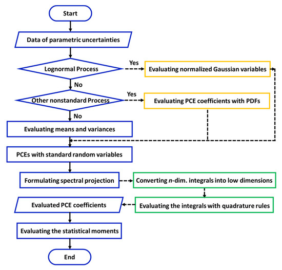 To address these issues, our previous works [29,30] have presented algorithms to combine the PCE with the generalized dimension reduction method (gDRM) or M-variate DRM [31]. This approach approximates high-dimensional integrals in the spectral projection (SP) [28] with a few low-dimensional ones. These low-dimensional integrals involve at most integration variables [29] that are much smaller than the number of uncertainties. To further reduce the computational cost, the lower-dimensional integrals resulting from the gDRM were calculated with a sampling-based method (i.e., Gaussian quadrature rules) [30]. However, our previous works only deal with uncertainty that follows a standard distribution as done in the classic PCE theory.