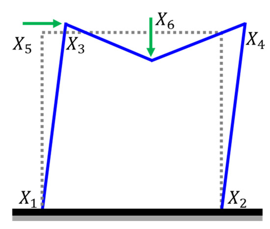 where and represent a vertical load and roof span that are used to calculate the nodal load , and A and E are the cross-sectional area and elastic modulus, respectively. In this case study, all parameters in the performance function in (25) are uncertain with predefined PDFs. This yields a six-dimensional random space . Details about the statistical description of uncertainties are given in Table 3.
