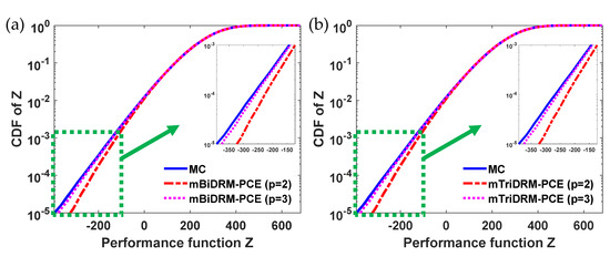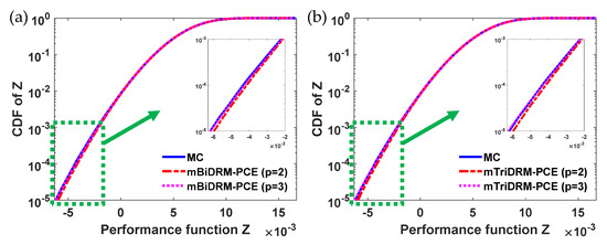 Like Example 1, Hermite polynomials were used as the basis functions, and the PCE expressions of lognormal uncertainties were constructed with normalized Gaussian variables. In addition, it is assumed that follows a Weibull distribution, for which the PCE expression was approximated with standard random variables using its PDF as described in Section 3.2. Additionally, to compute the unknown PCE coefficients of the performance function in (25), the mBiDRM and mTriDRM were used to reduce the computational cost by converting the high-dimensional integrals into low-dimensional ones, which were further approximated with quadrature points constructed by the Gaussian–Hermite quadrature rules. Note that the number of quadrature points for each dimension was set to 5 as done in Example 1. To quantify the UQ accuracy, the relative errors defined in (24) were calculated by referring to the results of MC. For MC, 107 samples were used to ensure UQ accuracy.