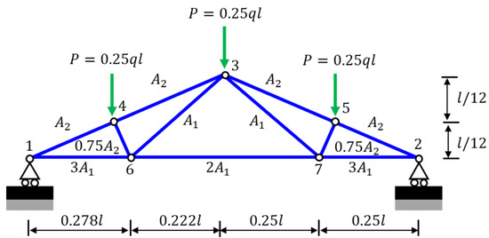 In this case study, E is the elastic modulus; and are the cross-sectional area corresponding to the specific member; and to represent external loads imposed on nodes from 8 to 13. As done in Example 3, the finite-element analysis was used to calculate the performance function as in [19,56]: