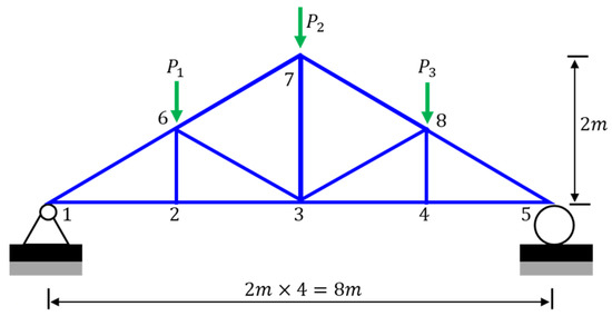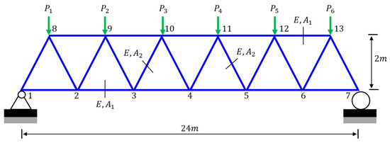 Illustration of a planar truss structure with 23 members [19,56]. Reprinted from [56], Copyright (2006), with permission from Elsevier.