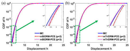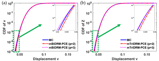 Comparison of the cumulative density functions of the displacement calculated with the algorithm in this work and with MC in Example 4. (a) mBiDRM-PCE and (b) mTriDRM-PCE.