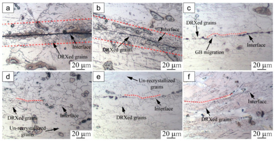 Evolution of the interfacial microstructure indicates that the bonding process is closely related to the development of fine DRXed grains under high strain level (0.4–0.6). Furthermore, the volume fraction and size of the DRXed grains increases with increased plastic deformation strain. The larger deformation offers more energy for interface bonding and atom diffusion, leading to better bonding quality [10,18]. With the formation and growth of DRXed grains, the new grains on the interface gradually grow up into the adjacent deformation regions, resulting in the migration of interfacial grain boundaries and the gradual elimination of the bonding interface.