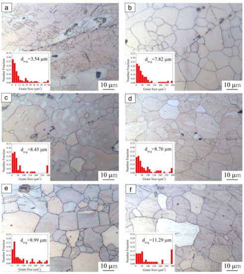 Grain size distributions of compressed specimens (350 °C, ε = 0.6), followed by post-heating treatment at 400 °C with different holding time: (a) without holding, (b) 1 h, (c) 2 h, (d) 4 h, (e) 8 h, (f) 12 h.