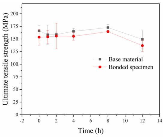 Ultimate tensile strength of the specimens with different holding times for base material and bonded specimens.