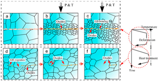 In summary, the interface bonding mechanism during hot compression and post-heating treatment of AZ31 magnesium alloy is schematically illustrated in Figure 7. As shown in Figure 7a, the interfaces are completely unbound prior to the joining process and oxides have formed along the interfaces upon heating. Once hot compression begins, the two metallic surfaces come into contact and the nucleation of DRXed grains initially occurs at the bonding interface (Figure 7b). As the strain increases, the DRXed grains gradually spread and continue to evolve. Driven by the stored energy difference correlated with the dislocation density near the grain boundaries, strain-induced GB migration occurs, resulting in the serration of the bonding line. Meanwhile, this process can produce large deformation, thus effectively breaking the possible surface oxide that is a barrier to the formation of a metal–metal bond. Consequently, the exposed fresh surfaces are then joined under the compressive force perpendicular to the interface, where the initial bonding interface turns into a GB migration area. This newly formed bonding area is named the GB bonding area. The bonding interface contains interspersed fine grains (Figure 7c). During the post-heating treatment, GB migration is driven by the growth of recrystallized grains. At this stage, there is no significant gradient of driving force for GB migration. With further increase in the holding time, the recrystallized grain boundaries migrate towards both sides of the bonding line (Figure 7d). As a result, the oxides migrate into the base material through GB and the initial bonding line gradually disappears (Figure 7e). After holding for enough time, the newly recrystallized grains spread across the bonding interface and a sound bonding finally forms with only a few dispersed small oxide particles (Figure 7f).