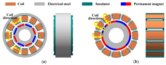 The TSLM differs from the CM mainly in the direction of flux linkage due to a different coil structure. As shown in Figure 2, when the magnetization direction of the permanent magnet is taken as a reference, the magnetic flux of the CM is linked to the coil in the radial direction, and the magnetic flux of the TSLM is linked to the coil in the circumferential direction. To drive the motor, a rotating magnetic field must be generated when a three-phase alternating current is applied to the coil.