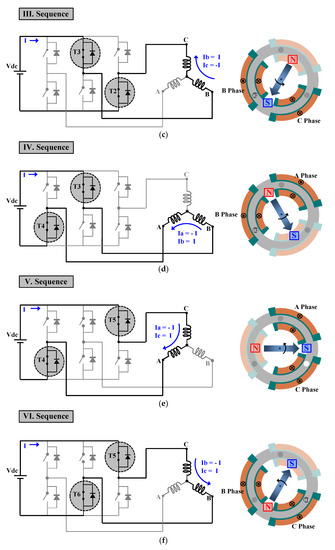 First, we described the principle of generating a rotating magnetic field by armature current using a BLDC six-step inverter. Figure 3 shows the circuit of a three-phase six-step inverter and a Y-connected slotless motor. Moreover, the Hall sensors are arranged at intervals of 120 degrees of electrical angle. For better understanding, a slotless motor with a 2-pole 3-coil bunch is taken as an example. As shown in Table 1, the operating element can be divided into six sections as per the signal of the Hall sensor. For continuous rotation using the detected rotor position information, the inverter generates two phase currents to the stator coil. Therefore, the rotating magnetic field in the counterclockwise direction is generated according to the switching sequence of the six sections as shown in Figure 4.