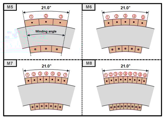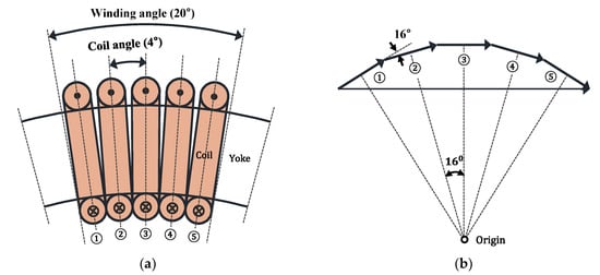 In the TSLM, because the coil is wound around the stator yoke, the phase difference of the flux linkage occurs between each coil turn. The model example of the 8-pole 12-coil bunch shown in Figure 8a is wound on 5 turns, and the winding angle is 20 degrees, which is the mechanical angle. The electrical coil angle is 16 degrees in Equation (16).
