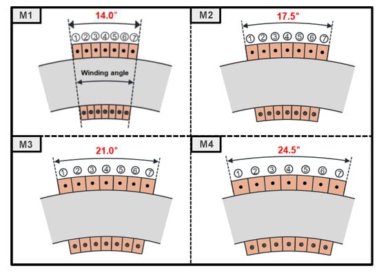 As shown in Figure 1a, in the case of the CM, the coil is wound by a winding machine inside the stator slot. Therefore, a space is required for the machine’s nozzle to enter the stator core, which is referred to as the slot opening. This appears repeatedly on the surface of the armature core by the number of slots and causes a magnetic reluctance variation according to the rotor position. As shown in Equation (1), cogging torque is generated as a result, and it appears as a period of the least common multiple (LCM) of the number of poles and number of slots.