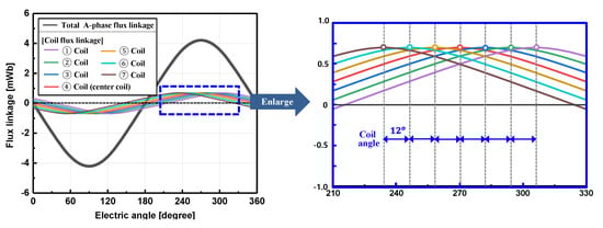 As shown in Figure 11, in the case of M3, a phase difference occurs in the coil angle of the electric angle between each flux linkage. The total flux linkage graph of the A-phase coil in Figure 11 is similar to the waveform of the flux linkage graph in Figure 5.