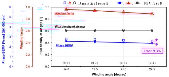 As shown in Figure 12, the air-gap magnetic flux density and winding factor according to the change in the winding angle are almost the same, within a 2% error. The calculated back EMF was approximately 9.3% higher due to the leakage flux between the permanent magnets generated in the FEA.