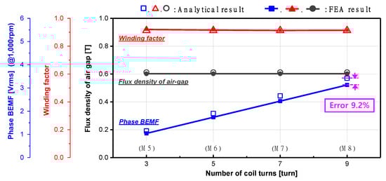 In the case of a model with a small number of turns, this formula may have a slightly lower accuracy than Equation (17). However, regardless of the number of turns or the coil angle, the winding factor of the TSLM can be calculated only with the winding angle. In Figure 14, the air-gap magnetic flux density, winding factor, and back EMF according to the change in the number of turns were compared with the FEA results. Because the shape of the yoke and the permanent magnet in the verification models are the same, the air-gap magnetic flux density is also the same, and the error in the FEA results is within 2%. Although the winding factor was calculated using the simplified Equation (22), accurate results were obtained within 1% of the error from the FEA results. The calculated back EMF was approximately 9.2% higher due to the leakage flux between the permanent magnets generated in the FEA. As such, when the winding angle is constant, it can be deduced that the slotless motor has a constant winding factor regardless of the number of turns.