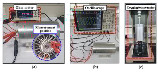 First, as shown in Figure 18a, the phase resistance was measured at the neutral point and the A-phase terminal before the lead wire. The resistance was calculated using Equation (20) and was approximately 10% lower than the measured value. In the prototype, there is inevitably a gap between the bobbin and the coil in the process of winding the coil, and the connection between each phase must be made. For this reason, the coil length of the prototype is inevitably longer than the calculated value, while the measured resistance is also higher.