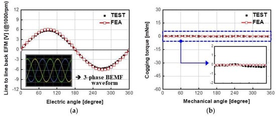 Further, the line-to-line back EMF was measured as shown in Figure 18b. The prototype was driven at 1000 rpm by an external drive system. In Figure 19a, the three-phase back EMF waveform was measured as a symmetrical sinusoidal waveform. Table 5 shows that the measured line-to-line back EMF was approximately 7.5% lower than the FEA result. This was considered to be caused by the permanent magnet’s magnetization and manufacturing tolerances.