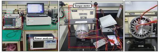 Finally, as shown in Figure 20, performance factors of the prototype such as speed, output, and efficiency according to the load torque were measured. A sensorless BLDC drive was used as the controller, and a power analyzer, oscilloscope, and dynamo torque meter were used as measuring equipment. Figure 21 shows the result of the measurements, and the performance of the prototype measured had a similar trend to the FEA result. However, the phase voltage was approximately 5% lower than the FEA result due to the voltage drop in the coil, which was caused by the increase in temperature in the high-torque, low-speed region. Because of the reduced phase voltage in the high-torque, low-speed region, the speed was reduced, and eventually the output power decreased by approximately 8%. The maximum efficiency of the prototype was measured to be approximately 80%. Because the prototype was designed for ease of fabrication rather than performance, the magnetic air-gap length is quite long. If optimal design of the coil diameter, number of turns, and air-gap length are achieved, the efficiency will be improved more than that of the prototype presented in this study.