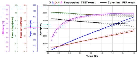 Finally, the resistance, back EMF and cogging torque of the prototype were measured. In addition, the motor’s performance parameters such as speed, output, and efficiency were measured through the dynamo load test. In this case, the phase voltage of the measured value was about 5% lower than that of the FEA result due to the voltage drop generated by the motor and controller in the high-torque region. As a result, the output power decreased by approximately 8% compared with the FEA result.