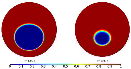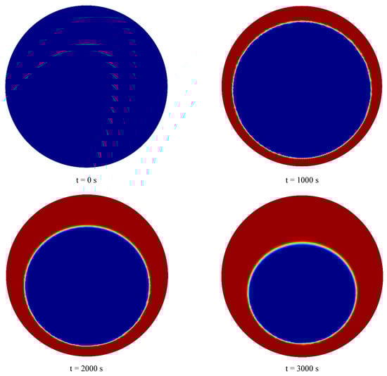 Initially, PCM melting contours in the tube are presented. Figure 4 shows the PCM melting contours at different times from 0 to 5000 s. It can be seen that the PCM inside the tube begins to melt over time. Melting starts from the outer surface of the tube and moves inwards. First, the upper parts of the pipe are melted, and then, parts of solid PCM are melted at the bottom of the tube due to free convection in the PCM. It can be seen that the entire PCM is not melted after 5000 s from the beginning of the process, which is due to the large diameter and volume of the PCM inside the tube. This can cause the freezing time to be longer. Hence, the heat is transferred from the tube to the air inside the wall for a longer time.