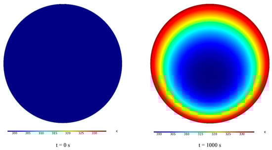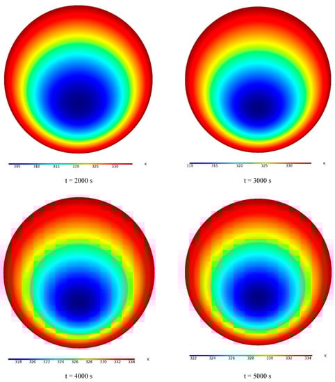Figure 5 demonstrates the TEM contours of a PCM-filled tube from 0 to 5000 s with a time interval of 1000 s. It is seen that the tube is full of cold PCM, and its TEM is uniformly cold. In this case, all PCM inside the tube is solid. It can be seen that the outer wall is heated due to solar radiation, leading to that the PCM is melted. The hot TEM created in the wall of the tube enters the tube over time and heats all the PCM inside it. Then, more of the tube space is marked by the red-color contour. Additionally, the middle parts of the PCM inside the tube remain solid and not melted over time. In this area, the tube is still cold and the PCM is solid.