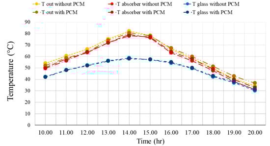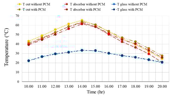 Figure 6 shows the TEM in three parts of the wall, including the outlet, the absorber plate, and the glass at different times of the day with and without PCM in the summer. Since radiation is directly related to the TEM of different points, the amount of TEM during the day is enhanced with the radiation. As time passes and the amount of solar radiation is reduced, the amount of wall TEM decreases. Another important point is the strong dependence of the outlet TEM on the absorber plate TEM. Therefore, as the TEM of the adsorbent plate is enhanced, the outlet TEM increases. Additionally, since the PCM is used on the back of the absorber plate, the TEM of the absorber plate has the highest value for all cases. Therefore, the output TEM is in the best condition. It can be seen that the use of PCM causes the TEM to reduce in the morning, but on the other hand, the outlet TEM as well as the TEM of the absorber plate and glass increase in the afternoon. Especially, the increment in the outlet TEM in summer makes the airflow in the Tr-W faster, and as a result, more airflow exits from the house.